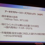 既存車体は、アフリカツイン、NT1100の活用。現行ラインナップと異なる位置づけの派生モデルとは、国内専用ロードスポーツ(=ホーク11)の開発です。市場規模、設定台数に対応した作り方まで検討、に関してはホーク11の特徴ともなっているロケットカウルとリアカウルのFRP成形に結びついています」
