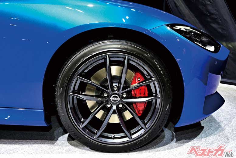 気になったのはタイヤサイズの速度記号です。新型フェアレディZが装着するタイヤは前255/40R19 96W、後275/35R19 96WのWの部分です。Wは許容最高速270km/hを示しています。