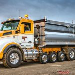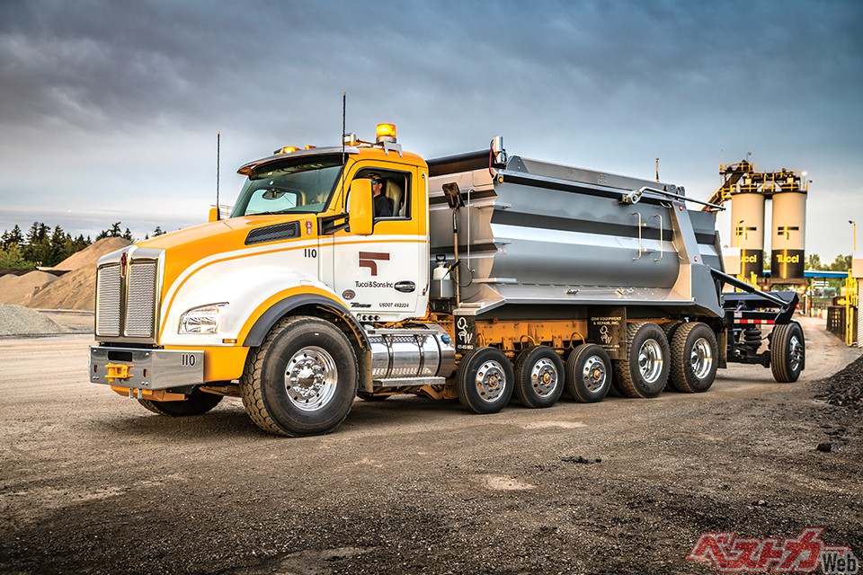 米国の一部の州では、単車ながらトレーラ同等の大積載量を備える「スーパーダンプ」が認可されている。写真はケンワースのクラス8コンベンショナル・T880 6×4をベースにエキストラアクスル3軸とタグアクスル1軸を追加、最大積載量25t、GVW36tを実現したもの。荷台はOSW社のテレスコホイスト式耐摩耗鋼製ハーフパイプダンプで、アスファルトを積載する。