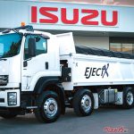 いすゞの海外専用モデル・FYXベースのGVW35tダンプ。豪州のシャウX製押出板式ダンプボディを架装したもので、荷台を上げずに積荷を降ろせる。