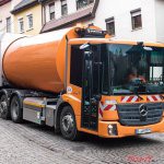 ドイツは都市内のごみ収集で大型塵芥車が多用されている。写真はメルセデスベンツ・エコニック6×2に、ファウン・ウンベルトテヒニクが開発した回転ドラム式の塵芥収集装置「ロトプレス」を架装したGVW26t車で、収集時には円筒形の荷箱がグルグル回る。