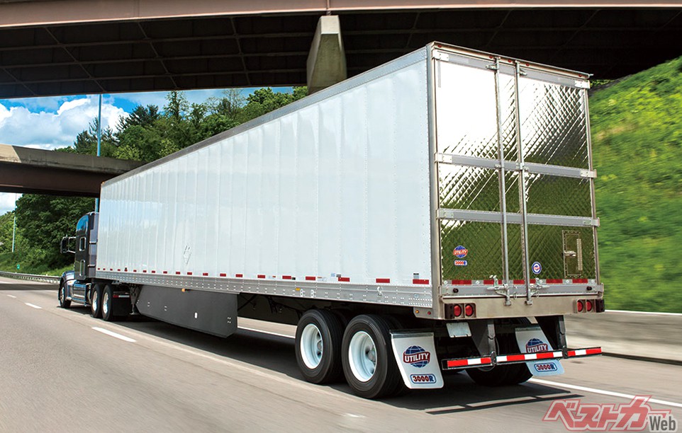 まずは米国で一般的なセミトレーラを紹介しておこう。写真は大手メーカー、ユーティリティ社のGCW53t級のエアサス2軸冷凍バンセミトレーラで、サイズは全長16.15m×全幅2.6m×全高4.1m、最大積載量24.94tだ。