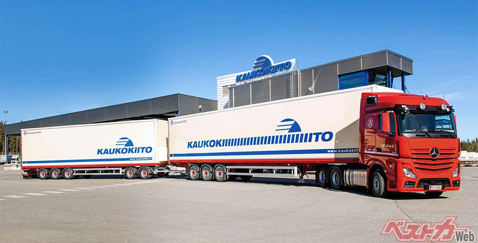 フィンランドでは2019年に「HCT関連法規」が施行され、最大連結全長34.5m・GCW76tのコンビネーショントレーラが正式に認可された。ダブル連結トラックは最大連結全長25m・GCW44tなので、その巨大さがわかる。