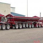 車輪だらけのこのコンビネーションは、アメリカの特装車メーカーが開発したもの。前方からセミトラクタ8×4、6軸セミトレーラ、4軸コンバータドーリ、6軸セミトレーラの4台で構成され、「Aダブル」という連結形態である。トレーラには、側方へ土砂を排出するサイドダンプが架装されている。