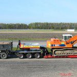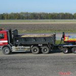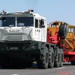 ベラルーシ・MZKTの重量物運搬コンビネーション。812馬力エンジンを搭載する巨大な8×8トラクタ・ヴォラートMZKT-741351が、最大積載量76tの平床6軸セミトレーラ・MZKT-999421を牽いている。
