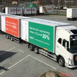 スウェーデンのHCT実証試験、DUO2プロジェクトの試験車で、ボルボFH6×2/4フルトラクタが2台の2軸センターアクスルトレーラを牽引する連結全長27.5mのコンビネーション。3台とも同国ラガブ社製のスワップボディ(水平脱着ボディ)システムを架装しており、一人で3台分運べる