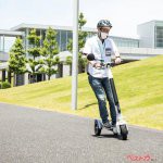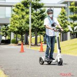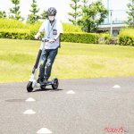 Striemoに試乗する担当渡邊。直線路はほぼ直立の姿勢で、コーナリング時にはスキーのように膝を曲げて車体を傾けるとスムーズに走行できる