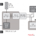 「ツインターボ」にも似たキーワードが名称につけられているが、2.4L直4ガソリンターボと、高出力モーターを直結した、2つの出力を組み合わせるため「デュアルブースト」と名付けられている。ここに有段の6速ATを組み合わせる。なお、後輪への動力伝達はプロペラシャフトではなく、BEVのレクサスUX300eやRZ、bZ4Xなどで採用されている、大出力の水冷付き電動パワートレイン「e-Axle」だ。