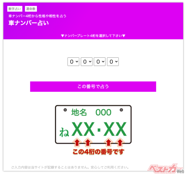 利用者は、自身の車のナンバープレート4桁を選択することで無料で占うことができ、数秘術を用いて導き出された性格や特徴、運気を上げるためのワンポイントアイドバイスを受けることができます。