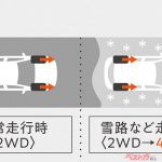 2WDに対する4WDの強みはトラクションに優れていることで、滑りやすい路面や不整地でも、4輪のうちどこかのタイヤが路面をとらえていればクルマは前に進める。この点2WDは不安定になりやすい。