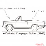 コンパーノ・ライトヴァンが1963年4月、つづいて同年6月にワゴン、11月に2ドア・ベルリーナと次々に発売された。じっさいにイタリアでデザインされたのはヴァンのプロトタイプのみで、ベルリーナへの変更はダイハツ社内で行なわれた。そして、1965年4月、待望のコンパーノ・スパイダーが登場してくる。