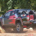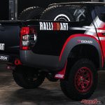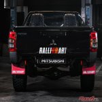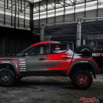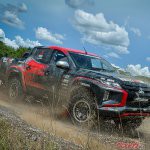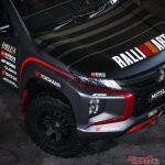 今回の参戦車両となるトライトン競技車は、国際自動車連盟(FIA)のGroup T1カテゴリー(改造クロスカントリー車両)に合致させたラリーカー。タイ仕様のダブルキャブをベースとし、ボンネット、前後ドア、内装部品などを軽量化するとともに、ロールケージやアンダーガードを装着するなどボディの要所を補強。ラリー専用のサスペンションを装着して、優れたハンドリング性能を実現した。前後LSDの採用や大径オフロードタイヤ&軽量アルミホイールの装着も相まって、悪路走破性を大幅に向上させている。