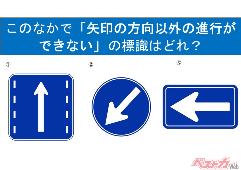 さて今回も、ブルーの規制標識からの出題です。「矢印の方向以外の進行ができない」標識はどれでしょうか?その指す先をよーく見てお答えください。え、見えない?もしかして免許の運転条件に「眼鏡等」って入ってますか?