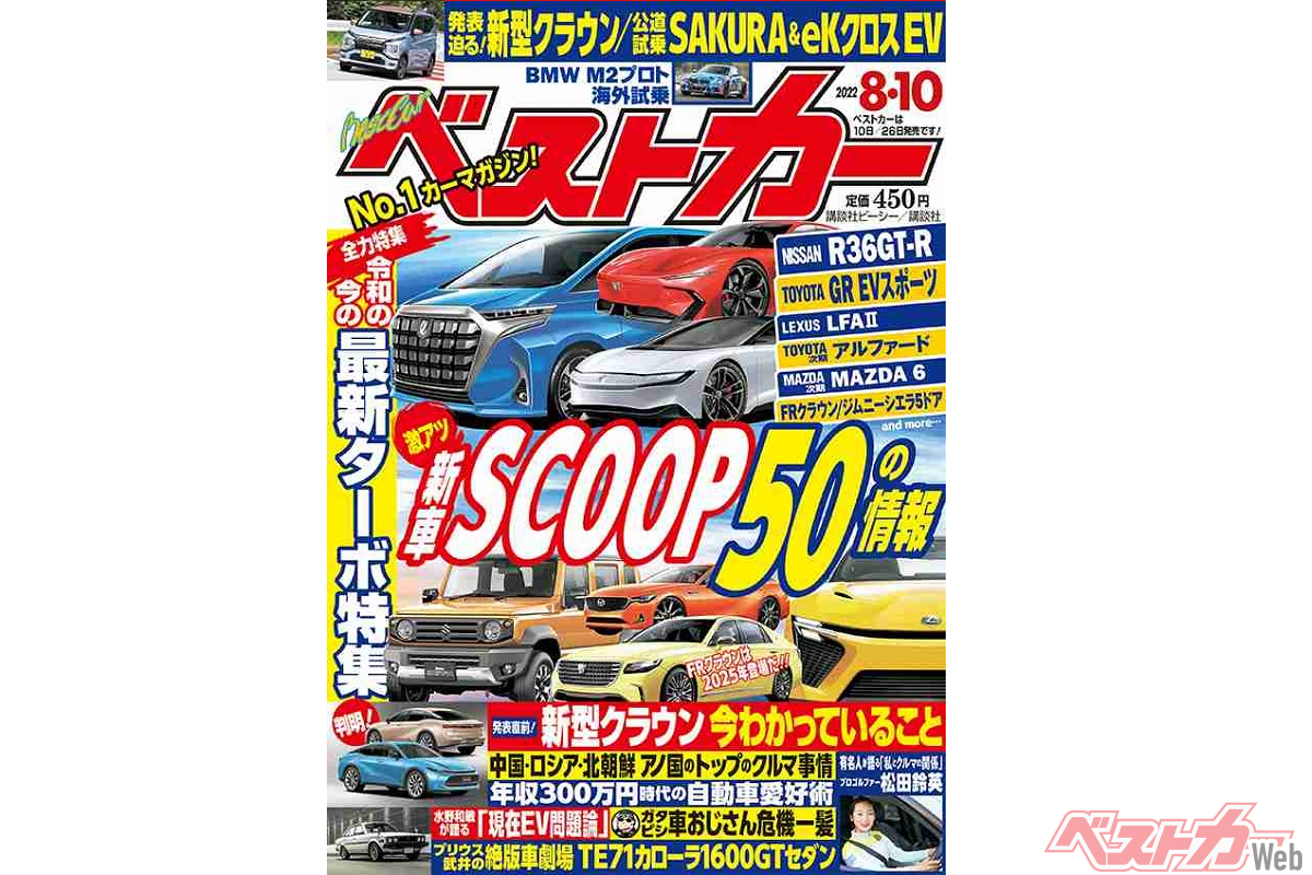 ベストカー8月10日号はまさに「SCOOP祭り」です! 「スクープ情報全部出しSpecial2022年夏バージョン」と題し、これから登場する50台の新車情報を特集で展開しています。その他、「新型クラウン最新情報」「令和のターボ特集」など盛りだくさん!!